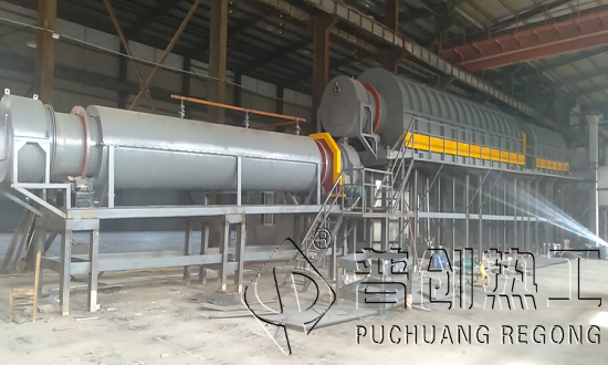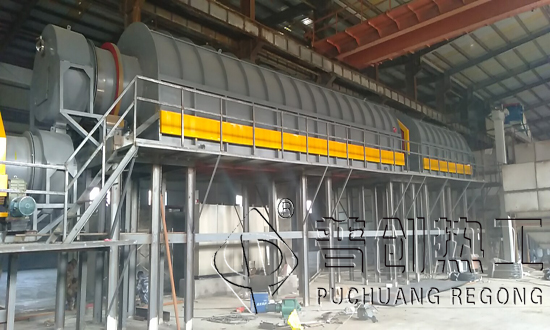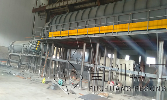 回转炉的热源来自电阻丝,本回转炉采用筒体底部加热方式。因此需要烘干的物料,从进料箱、进料溜进入筒体,即被螺旋抄板推向后。由于回转炉倾斜放置,物料一方面在重力和回转作用下流向后端,另一方面物料被抄板反复抄起,带至上端再不断地扬撒下来,使物料在筒内形成均匀的幕帘,充分与筒内的热气流进行热交换,由于物料反复扬撒,所含的水分逐渐被烘干,从而达到烘干的目的。项目现场