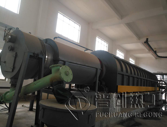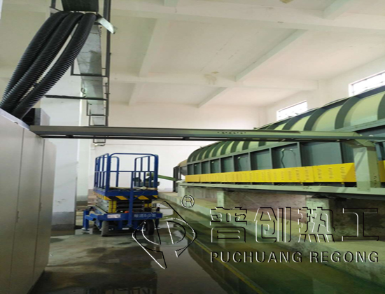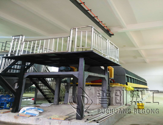回转炉的热源来自电阻丝,本回转炉采用筒体底部加热方式。因此需要烘干的物料,从进料箱、进料溜进入筒体,即被螺旋抄板推向后。由于回转炉倾斜放置,物料一方面在重力和回转作用下流向后端,另一方面物料被抄板反复抄起,带至上端再不断地扬撒下来,使物料在筒内形成均匀的幕帘,充分与筒内的热气流进行热交换,由于物料反复扬撒,所含的水分逐渐被烘干,从而达到烘干的目的项目现场